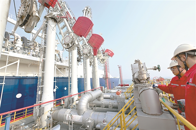 随着供暖季的临近,连日来,担负京津冀地区储气调峰任务的中国石化天津液化天然气(LNG)接收站码头迎来船舶接卸高峰。图为10月29日,工作人员在中国石化天津LNG接收站2号泊位巡检。 新华社记者 赵子硕 摄