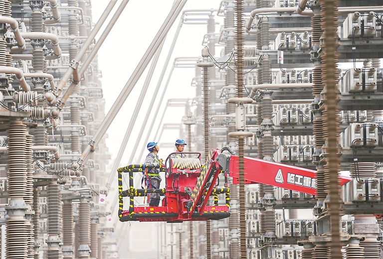 近日,昌吉-古泉±1100千伏特高压直流输电线路的受端站——安徽宣城古泉换流站迎来“体检”。图为10月29日,国网安徽电力检修人员对古泉换流站设备进行检修、维护,为电网顺利迎峰度冬打下坚实基础。 新华社发(郑贤列 摄)