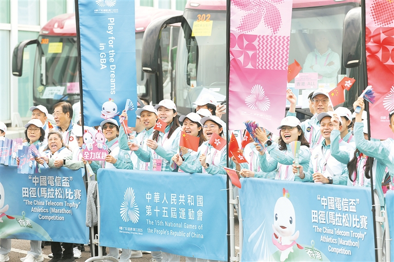 11月15日,志愿者在路旁为第十五届全国运动会女子马拉松参赛选手加油。新华社记者 毛思倩 摄