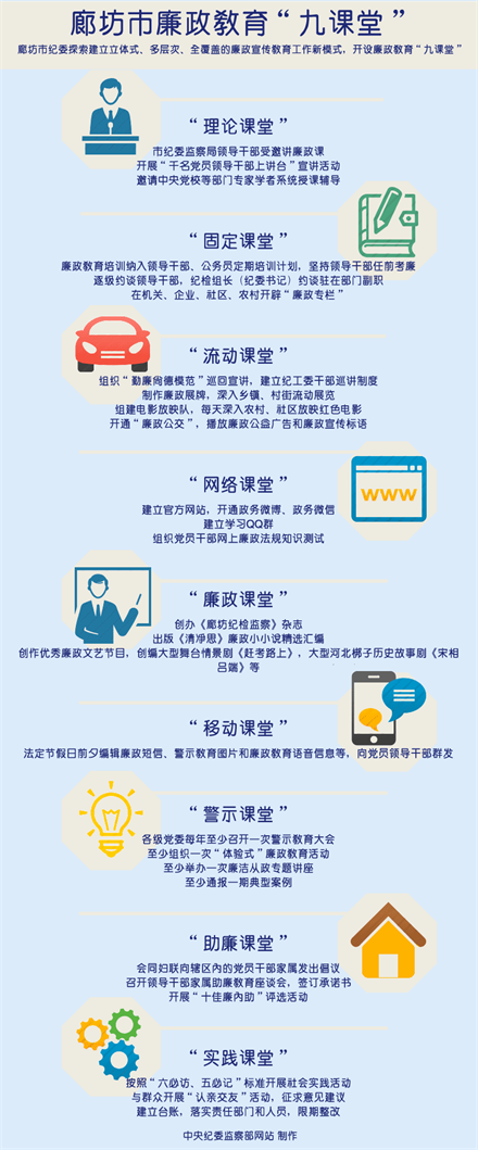 今年以来,河北省廊坊市纪委监察局围绕强化党员干部纪律意识,通过开设党风廉政教育“九课堂”,探索建立了立体式、多层次、全覆盖的党风廉政教育新模式,教育广大党员干部严格遵守党的纪律——