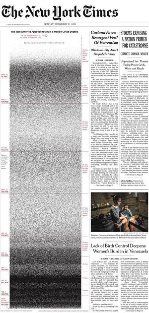 当地时间2月21日,《纽约时报》在其头版发布了一张巨幅图片,这张图片上有近50万个黑点,每一个点代表一个死于新冠肺炎的美国人。在图表的时间轴上,随着时间变化,分布得愈加紧密。