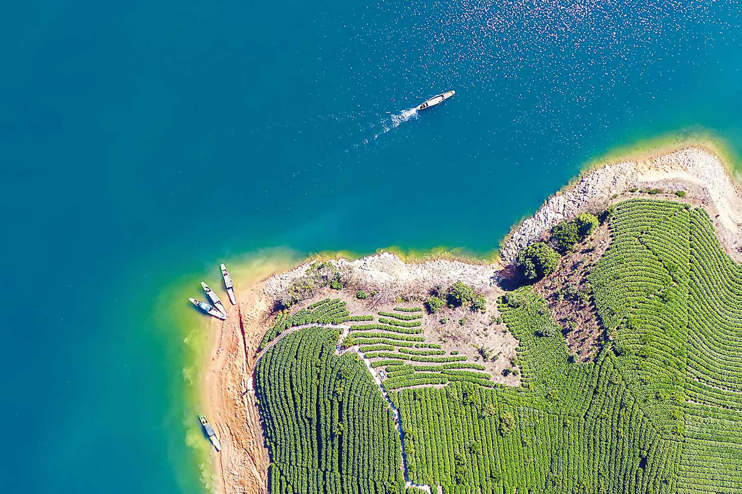 图③:浙江省淳安县依托生态优势大力发展茶叶产业,促进当地农民扩大收入来源。图为茶农的小船沿着茶山划过。毛勇锋 摄