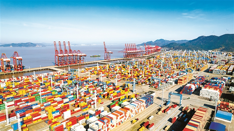 图为近日,宁波舟山港穿山港区正在开展作业。宁波舟山港货物吞吐量连续14年位居全球第一。 图片来源:视觉中国