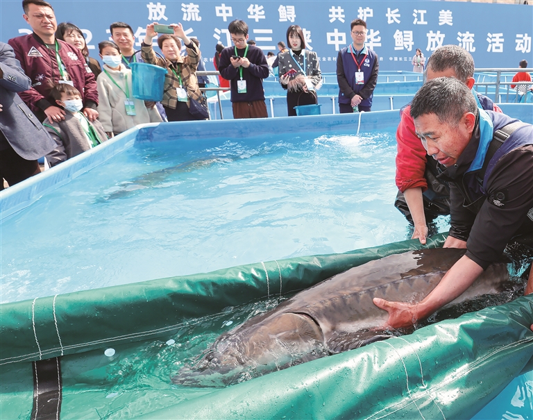 为实现对中华鲟野外种群数量的补充和年龄结构的调节,有关部门在湖北省宜昌市胭脂园长江珍稀鱼类放流点,举行长江三峡中华鲟放流活动。图为工作人员在活动现场转运中华鲟,准备放流。新华社发(杨东 摄)