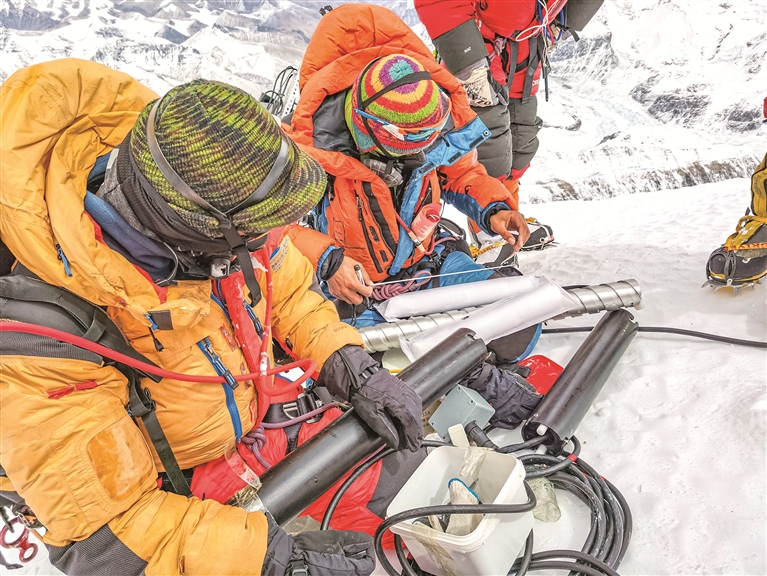 5月23日,科考登顶队员在珠峰峰顶取雪冰样品。 新华社特约记者 拉巴 摄