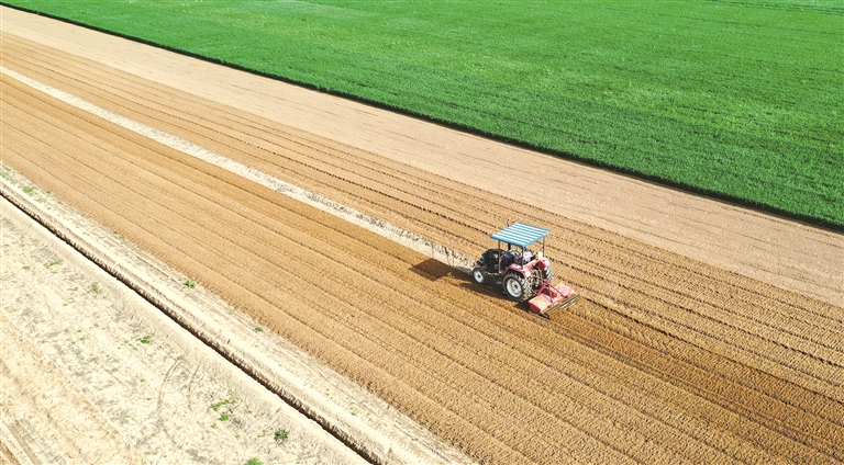 图为在河南省周口市淮阳区王店街道高标准农田示范区,一台拖拉机正在田间翻耕土地。
