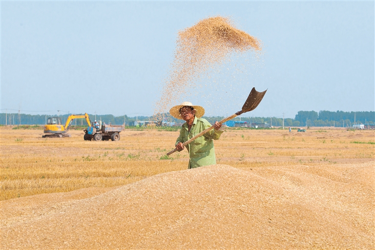 图为近日,在山东省高青县黄河滩区一处旧村复垦后的农田里,合作社的农民在堆放小麦。 图片来源:视觉中国