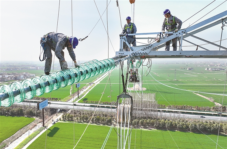 开春以来,电力工人抢抓春季有利天气,奋战在施工一线,确保重点工程进度有序推进。图为3月20日,安徽送变电工程有限公司施工人员在安徽利辛电厂二期500千伏送出工程现场作业。 新华社发(郑贤列 摄)