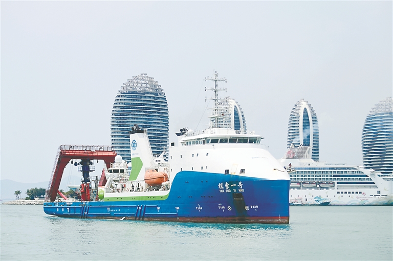 近日,我国科研人员顺利完成中国-印度尼西亚爪哇海沟联合深潜任务。图为3月28日,“探索一号”科考船搭载“奋斗者”号全海深载人潜水器返回海南三亚。 新华社发(沙晓峰 摄)