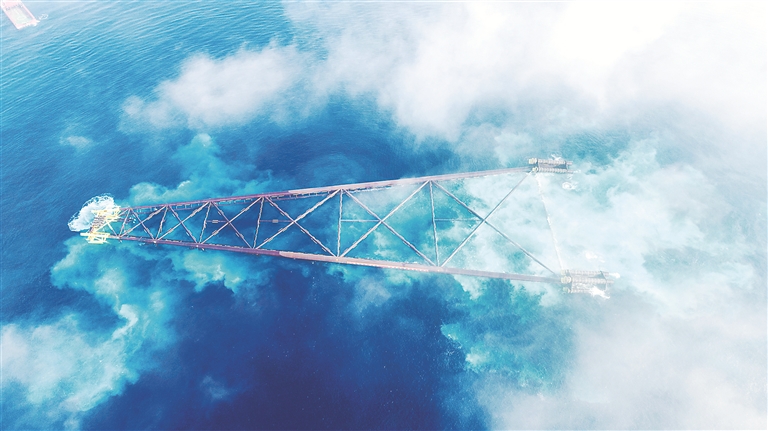 图为近日,亚洲第一深水导管架“海基二号”下水。 (图片来源:视觉中国 珠海特区报 张洲 摄)