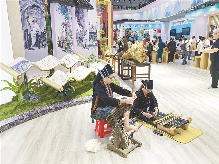 5月23日,第二十届中国(深圳)国际文化产业博览交易会在深圳国际会展中心开幕。图为当日,黎锦传承人在文博会现场展示黎族传统纺织技艺。侯颗 摄