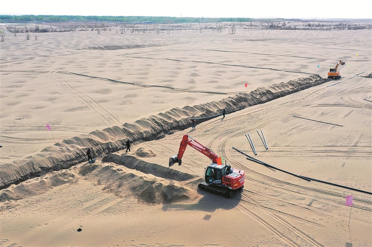 今年,新疆计划完成“三北”工程建设任务1194.01万亩。图为在新疆和田地区民丰县防沙治沙试验站,施工人员驾驶机械预埋输水管线。 新华社记者 丁磊 摄
