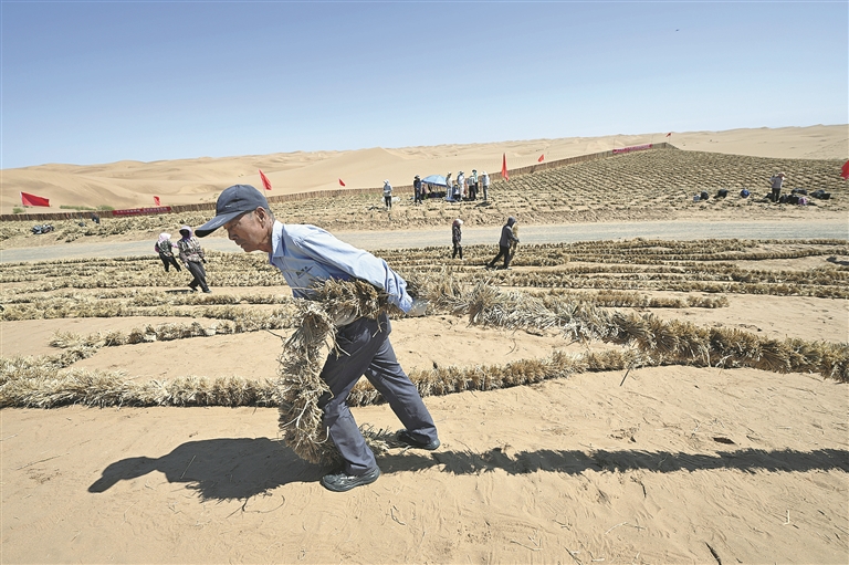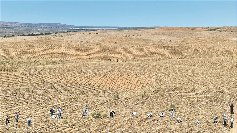 6月30日,在位于宁夏中卫市长流水村的腾格里沙漠东南缘,随着治沙工人将最后一列草方格稳稳扎下,这项跨越半个世纪的治沙工程,在腾格里沙漠宁夏境内实现全面锁边。 图为长流水村腾格里沙漠东南缘治沙锁边工程现场。