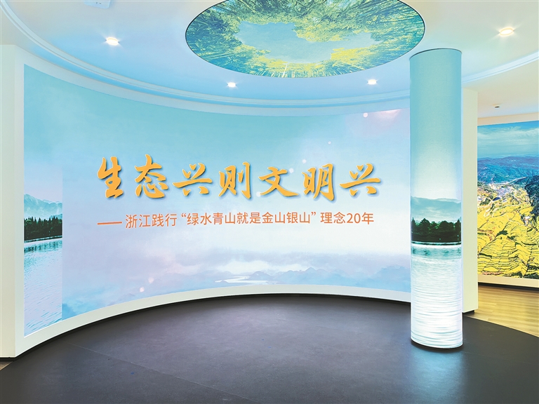 浙江余村,绿水青山就是金山银山理念的发源地。近日,生态兴则文明兴——“绿水青山就是金山银山”理念提出20年浙江主题展在这里开幕。沿着“思想之光”“精彩蝶变”“谱写新篇”的脉络,既能清晰感受余村的生态蝶变,也能深刻体悟这一重要理念蕴含的深邃哲思。