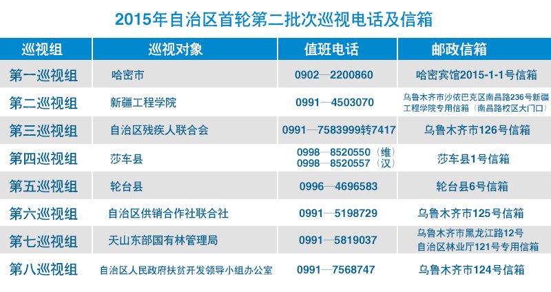 近日,新疆维吾尔自治区2015年首轮第二批次巡视完成进驻。巡视期间,各巡视组均设专门值班电话和专门邮政信箱,主要受理反映被巡视地方、部门、单位领导班子成员、下一级领导班子主要负责人和重要岗位领导干部问题的来信来电来访,重点是关于执行党的政治纪律、党风廉政建设、作风建设、贯彻中央八项规定精神和自治区党委十条规定、干部选拔任用等方面的举报和反映。其他不属于巡视受理范围的信访问题,将按规定由被巡视地方、部门、单位和有关部门认真处理。(新疆维吾尔自治区纪委)