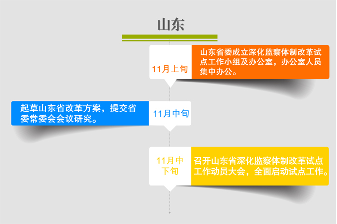 山东省纪委于6月28日成立监察体制改革准备工作领导小组,由省纪委常务副书记、省监察厅厅长明春德任组长,省纪委办公厅、组织部、案管室、研究室、法规室等负责同志为成员,负责收集整理、定期编辑涉及监察体制改革试点工作的相关资料,结合山东省实际提出监察体制改革准备阶段的相关工作建议。10月31日,省纪委向省委提交《关于成立山东省深化监察体制改革试点工作小组及其办公室的建议》。