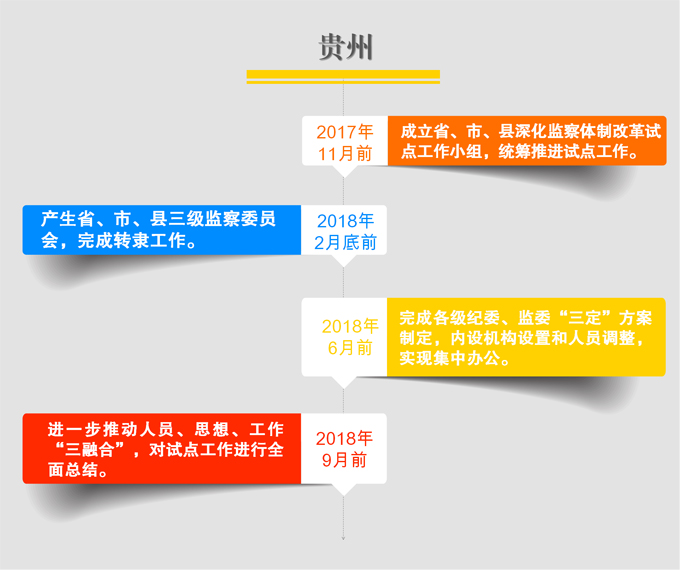 11月1日,贵州省委常委会议对《贵州省深化监察体制改革试点实施方案》和《关于成立贵州省深化监察体制改革试点工作小组的建议方案》进行了审议,同意成立贵州省深化监察体制改革试点工作小组,省委书记孙志刚担任组长。在省纪委设立工作小组办公室,省委常委、省纪委书记夏红民兼任办公室主任。办公室分设综合组、法律组、组织组、宣传组、市县指导组,具体抓好各项试点工作。