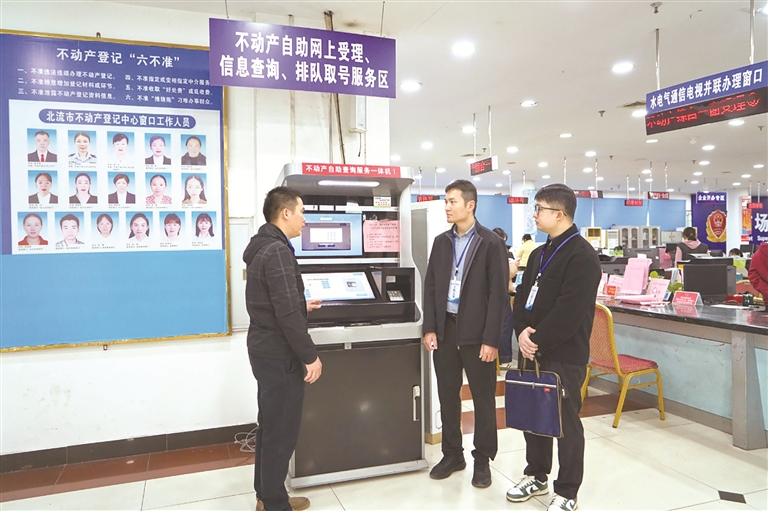 广西壮族自治区北流市纪委监委紧盯群众反映强烈的不动产“登记难”问题,通过约谈提醒、发放提示函等方式,推动自然资源、住建、财政、税务等部门成立工作组,打通不动产登记工作中的堵点。图为近日,该市纪检监察干部在市不动产登记中心了解有关情况。 李家辉 摄