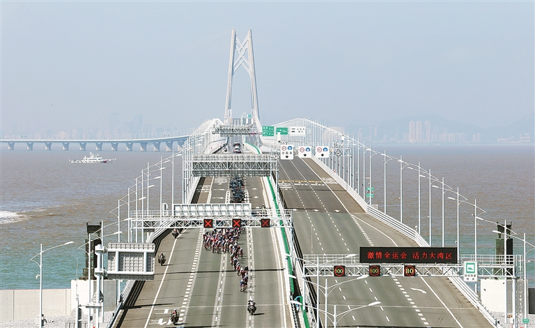图为第十五届全国运动会公路自行车男子个人赛参赛选手在港珠澳大桥上骑行。 新华社记者 梁旭 摄