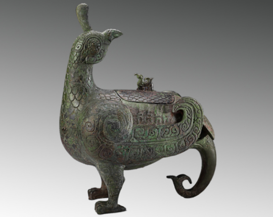 2001年,北京大学考古文博学院的师生开始修复鸟尊,经过反复拼对、修补、去锈后,一件惊世之器再现人间。它呈高冠凤鸟形,作回首站立状,圆眼,钩形眉,两翼上卷,尾部为一鼻向内卷的象首,身上饰有羽毛及云雷纹,两翅和两足饰卷云纹,背上有盖,盖内侧及器内有铭文,可惜尾部残缺了一块。