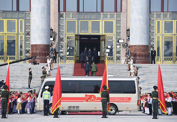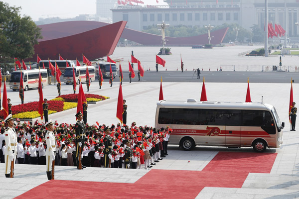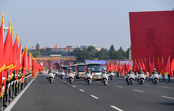 9月29日上午,国家勋章和国家荣誉称号获得者乘坐礼宾车,在国宾护卫队的护卫下,前往人民大会堂。