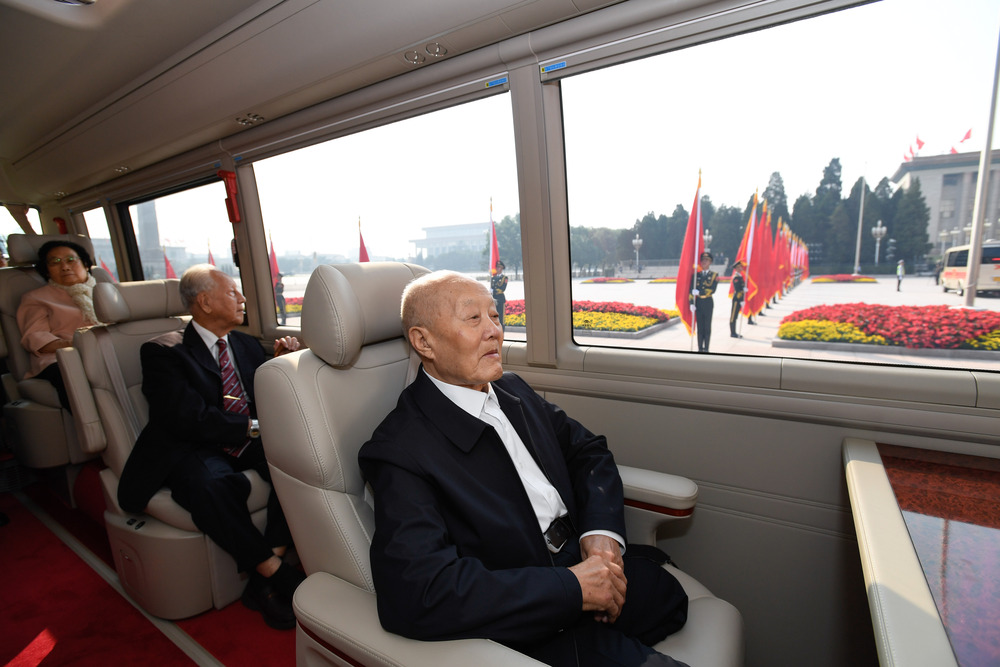 9月29日上午,“共和国勋章”获得者张富清、袁隆平、黄旭华、屠呦呦乘车抵达人民大会堂东门外广场。