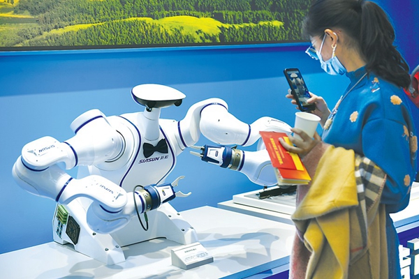 今年9月27日开幕的“奋进新时代”主题成就展上展出的沈阳新松双臂协作机器人。 (中新社记者 田雨昊 摄)