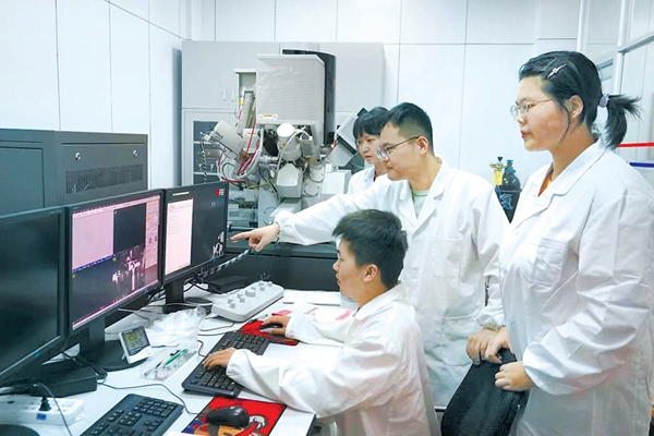 中南大学粉末冶金国家重点实验室的科研人员正在分析实验数据。 (中南大学供图)
