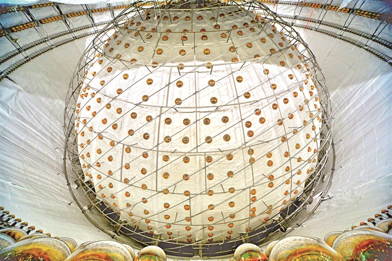 秦中华介绍:“直径35.4米的有机玻璃球,才能装下2万吨液体闪烁体;有机玻璃球这么大,不锈钢网壳就更大,直径达41.1米;这么大的探测器,要增强探测覆盖率,就需要很多光电倍增管……一系列设计环环相扣,超大规模与超高精度相辅相成。每一个关键部件都足够先进,共同构成了这国际领先的大科学装置。”