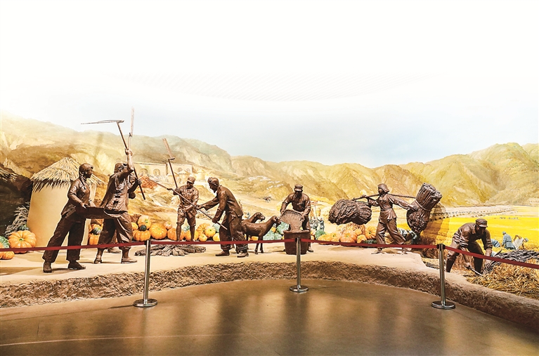 南泥湾大生产纪念馆内的雕塑作品。中国共产党领导抗日军民自力更生、艰苦奋斗,把南泥湾变成“陕北的好江南”。新华社记者 樊雨晴 摄