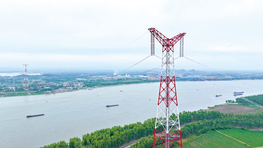 金上—湖北工程湖北段洪湖至嘉鱼长江跨越段跨江塔。 受访单位提供