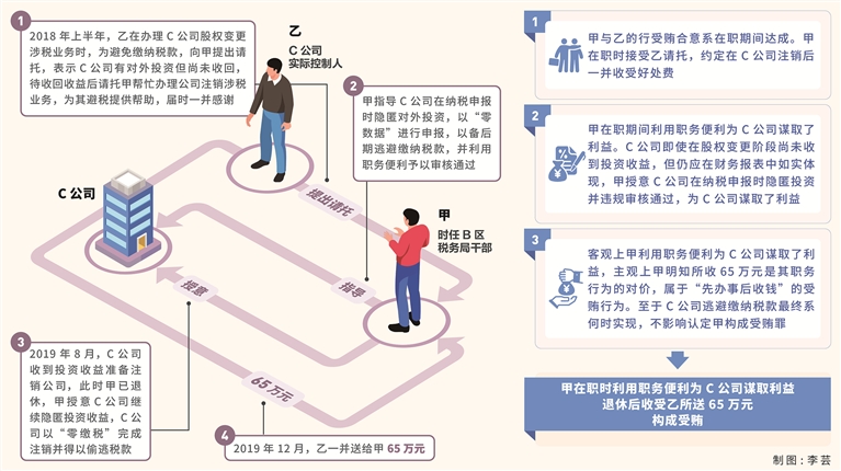首先,甲与乙的行受贿合意系在职期间达成,甲在职时接受乙请托帮助办理C公司股权变更及后期注销的涉税业务,并约定在企业注销后一并收受好处费。其次,甲在职期间利用职务便利为C公司谋取了利益,C公司即使在股权变更阶段尚未收到对外投资收益,但仍应在财务报表中如实体现。甲授意C公司在纳税申报时隐匿对外投资并违规审核通过,使得C公司该笔投资及收益在后期注销阶段难以发现,系利用职务便利为C公司谋取了利益。最后,在C公司注销阶段,因C公司“无经营”符合简易注销条件,无须实质审核,使得C公司以形式审核完成注销,未缴纳任何税款,其中,甲在职时的违规审核发生了关键作用。因此,甲利用职务便利为乙不缴税款提供帮助,收受乙所送钱款65万元,系受贿犯罪。