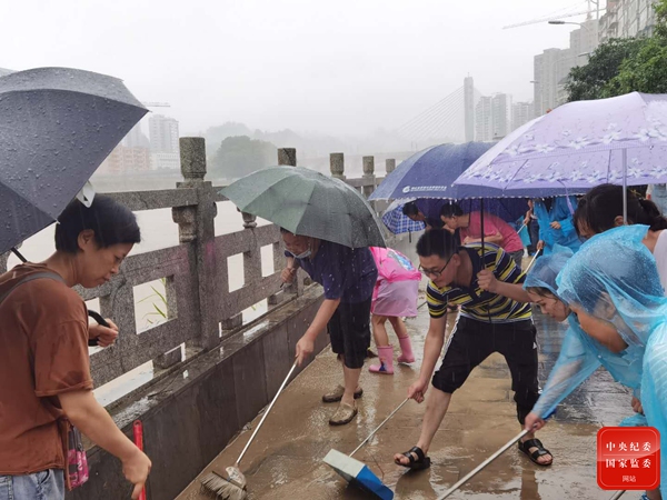 7月18日,湖北省恩施市纪检监察干部黄胜弘(中间戴眼镜)跟其他党员干部一起在清淤。